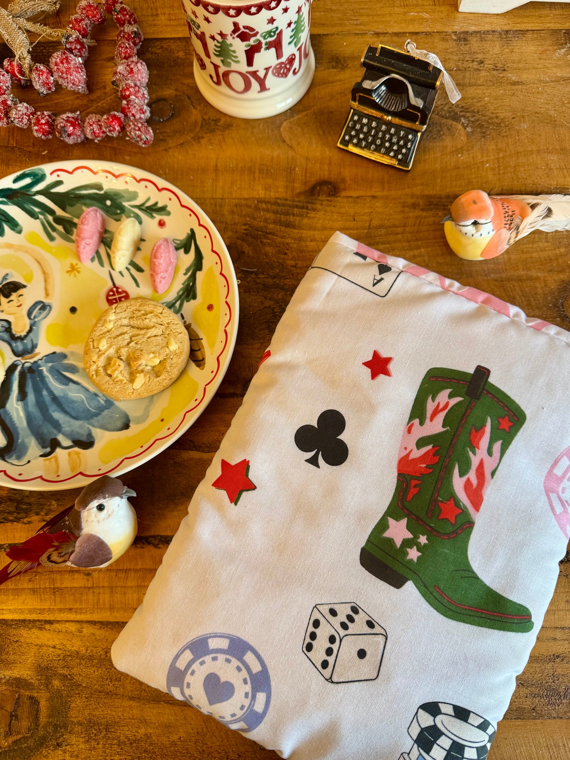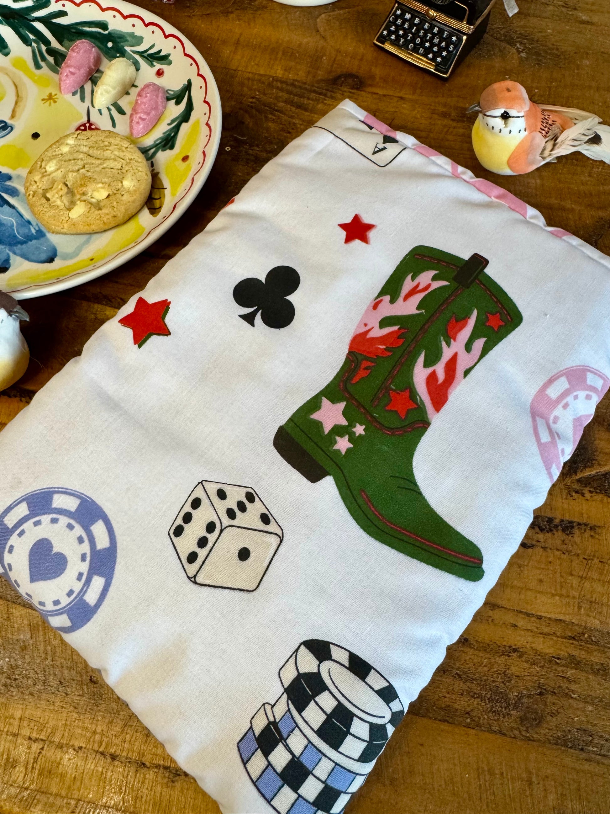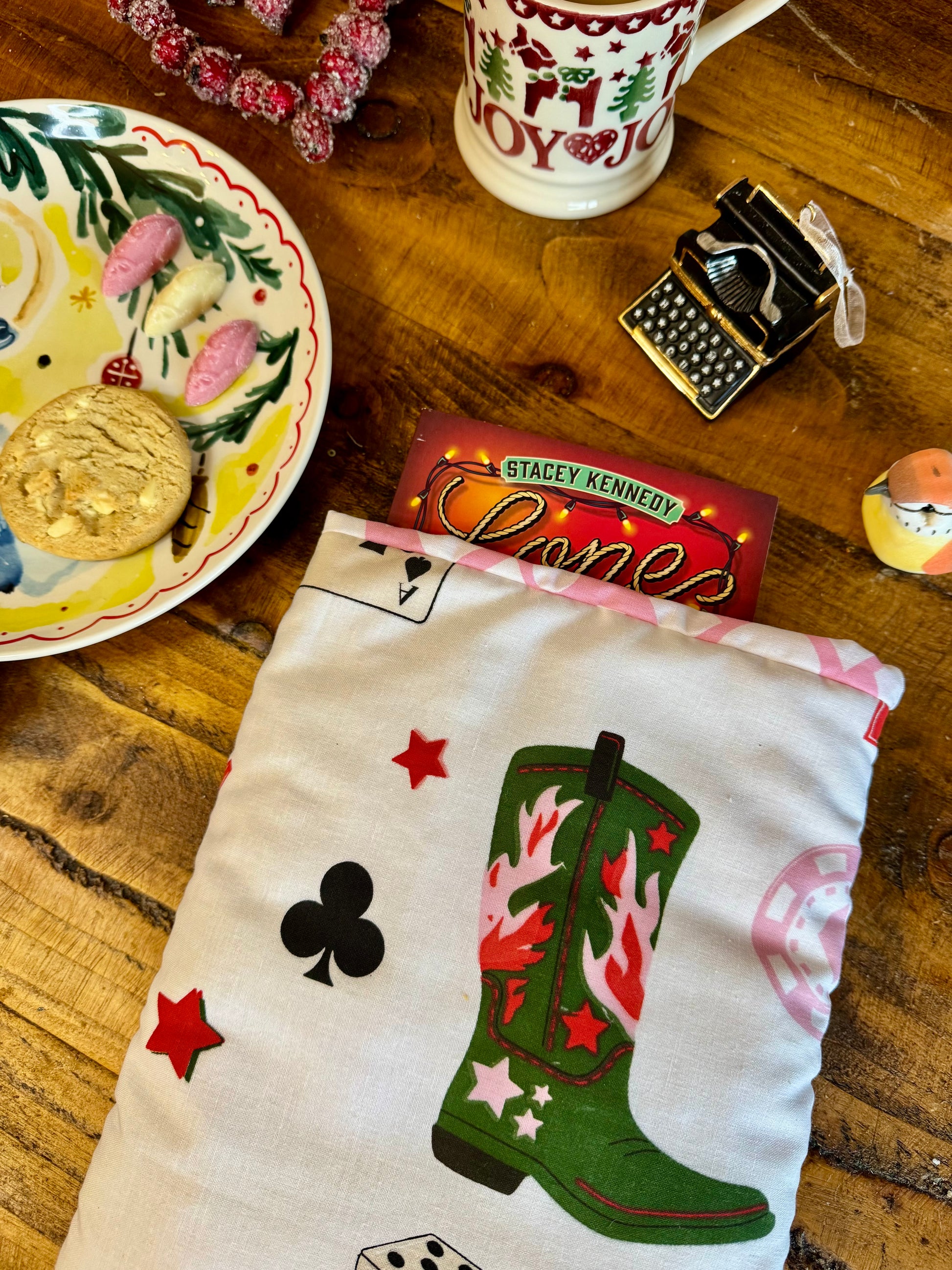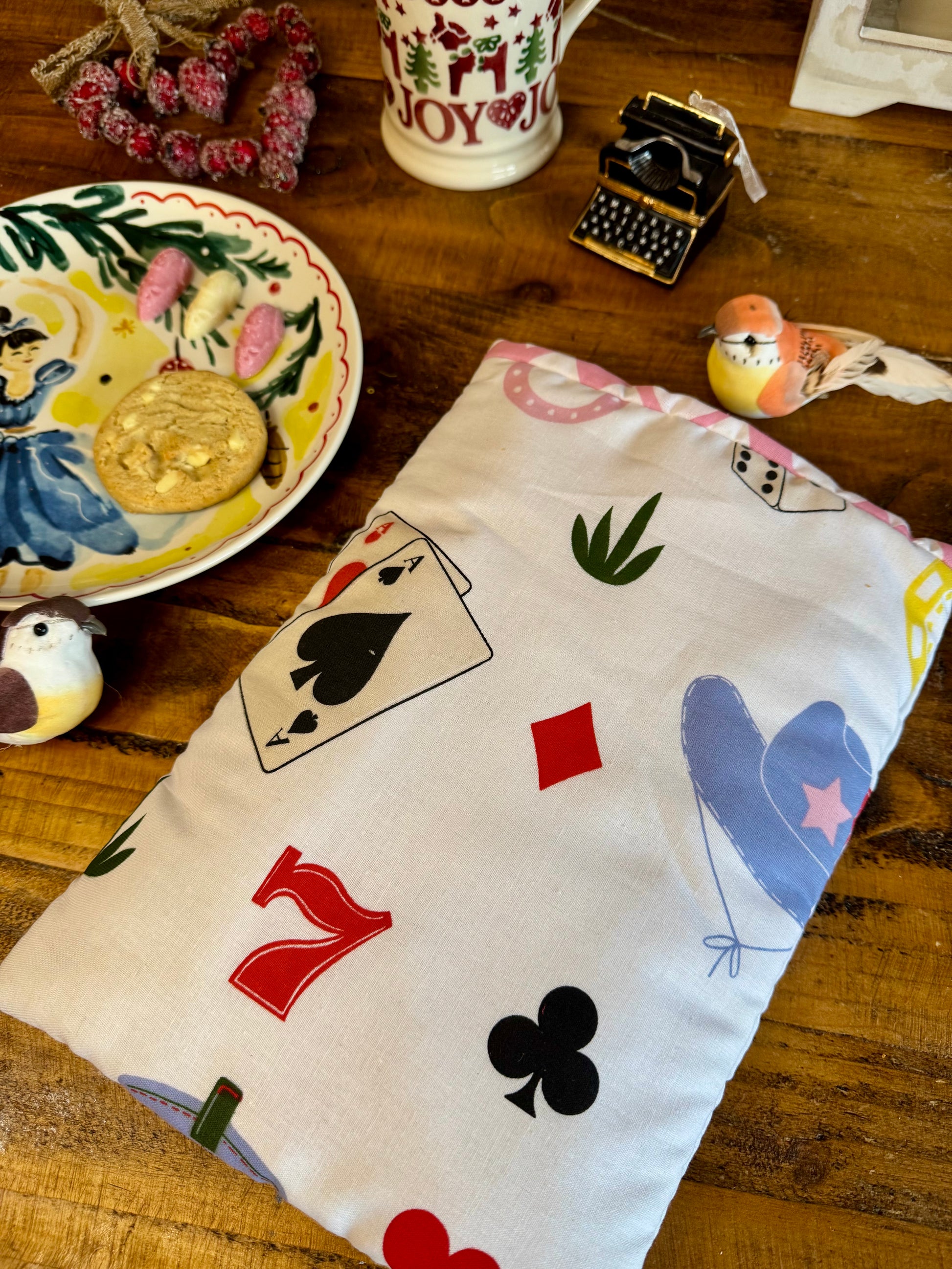 This book bed has been made using duvet cover fabric. It has wadding to protect the contents within the book bed. It has been lined with duvet cover fabric which features clubs, hearts, diamonds and spade print.