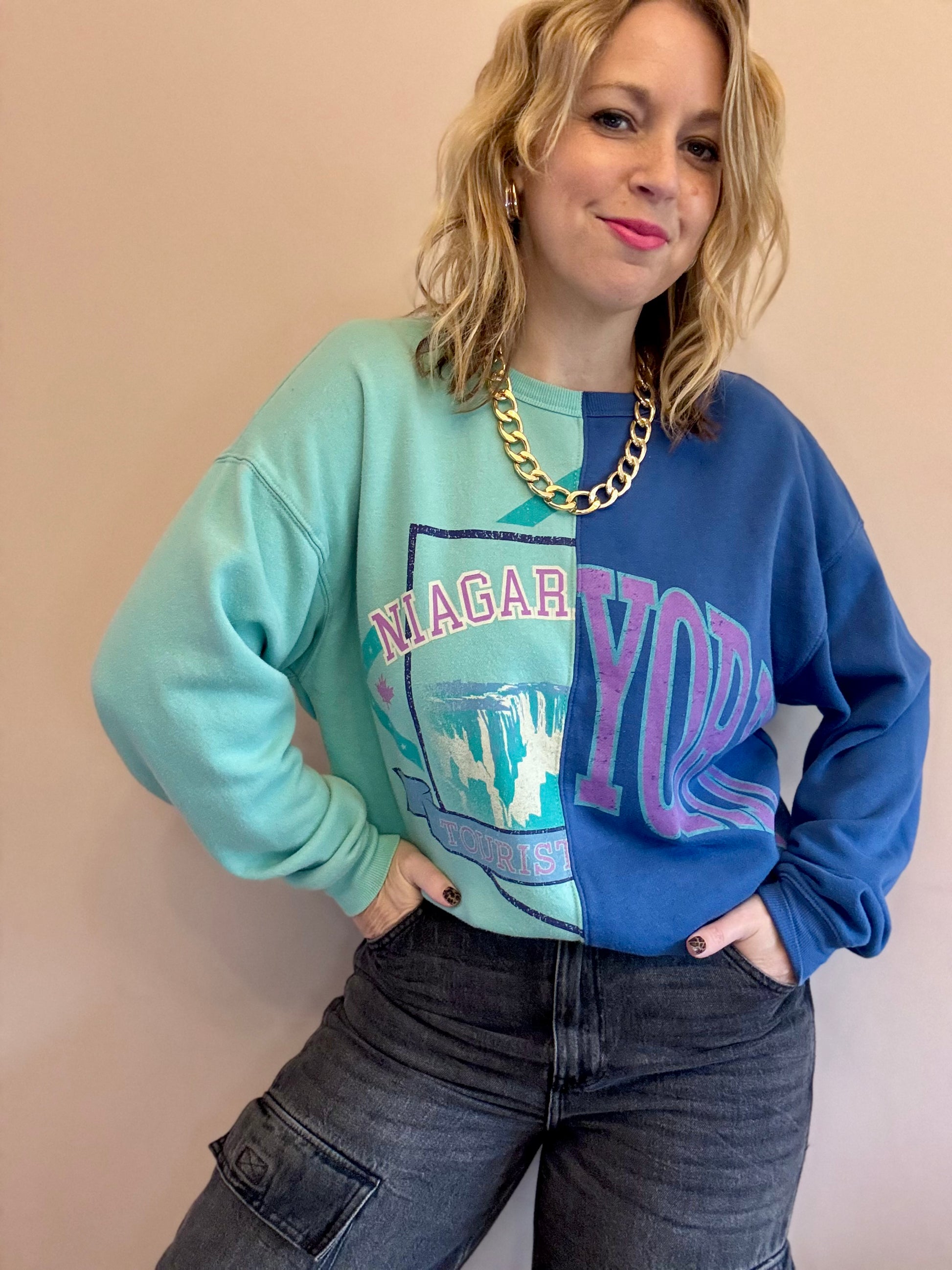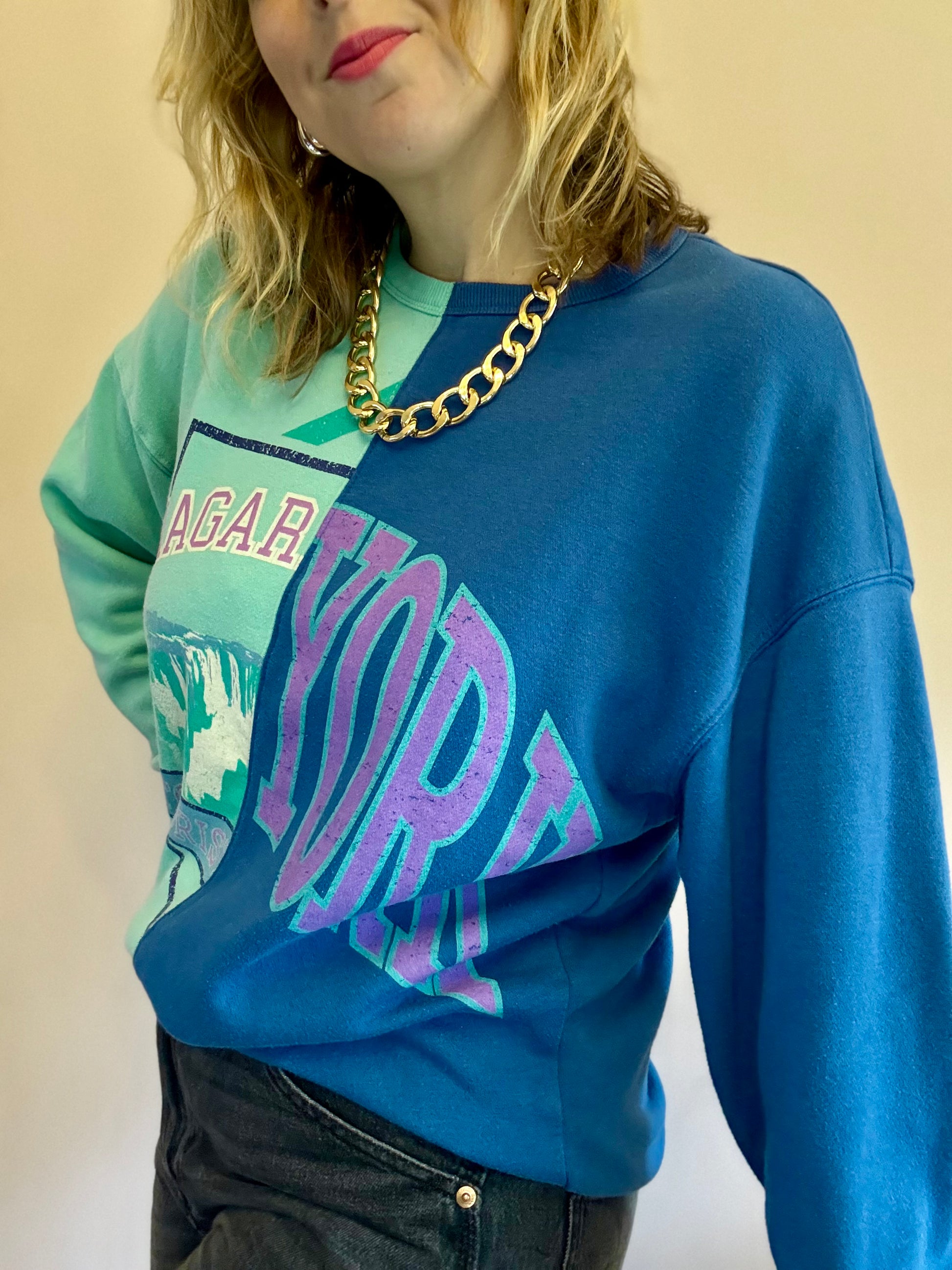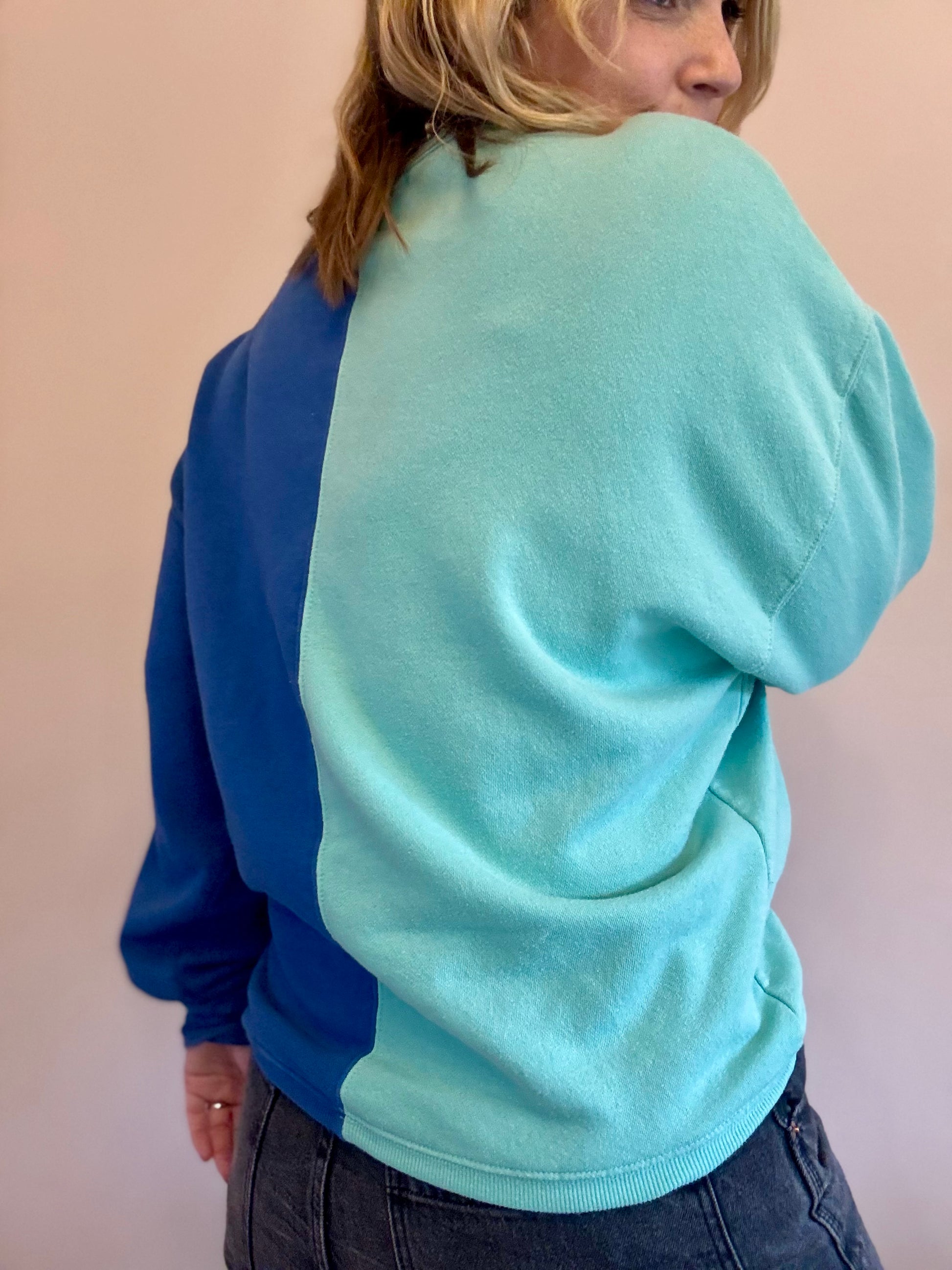 This sweatshirt has been made taking two different sweatshirts and stitching them together.