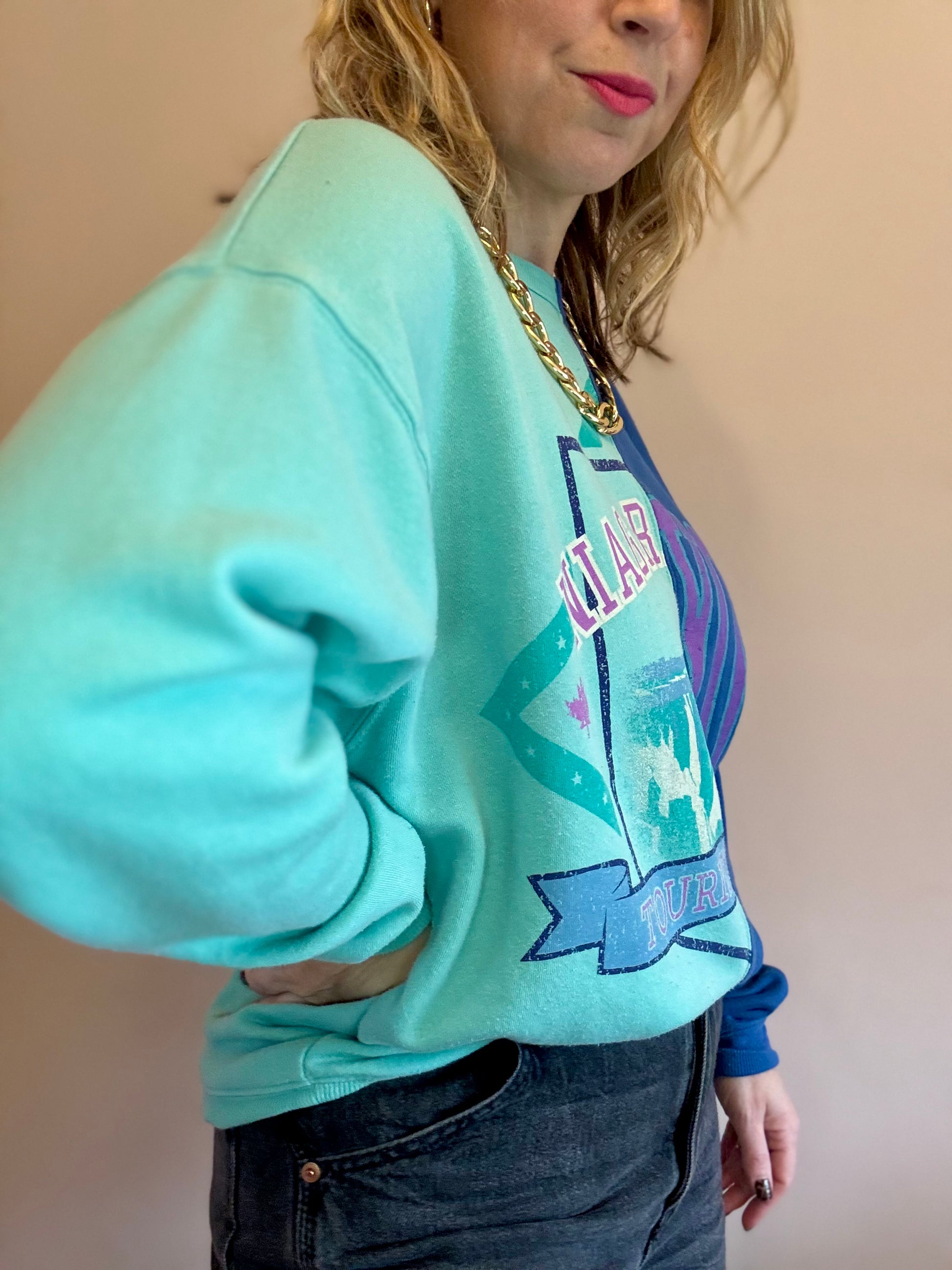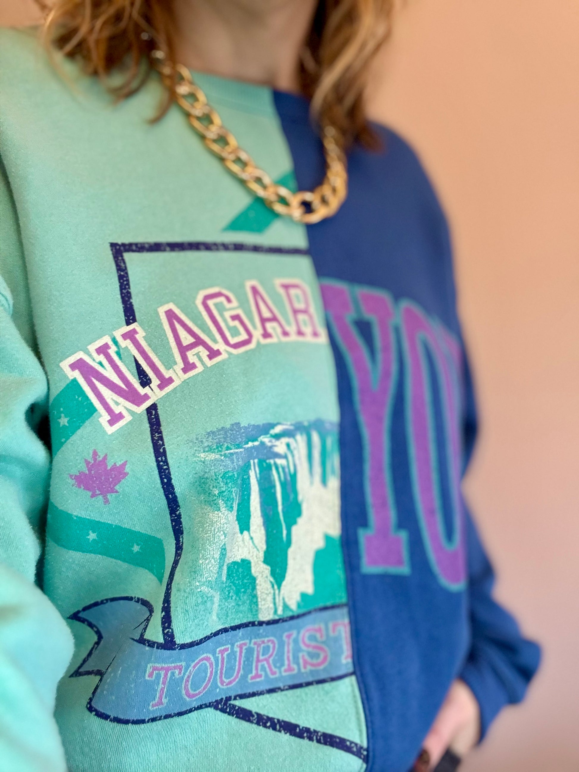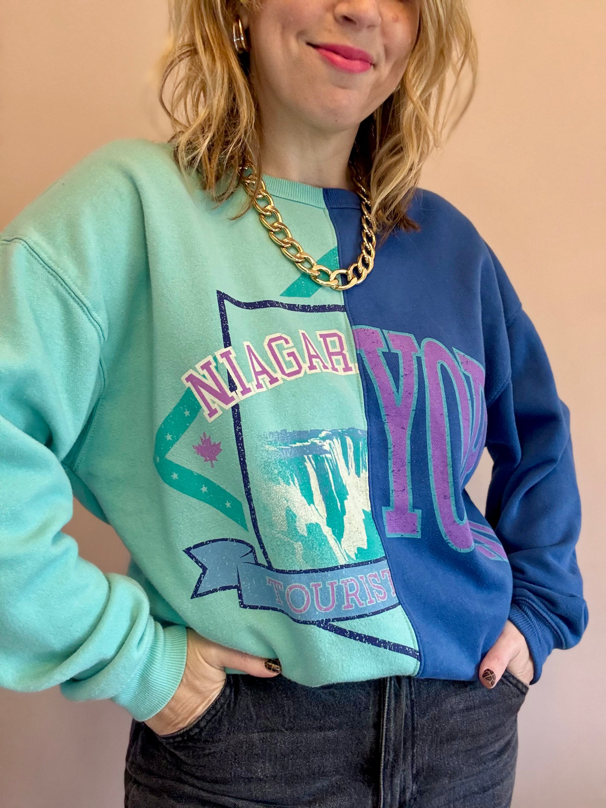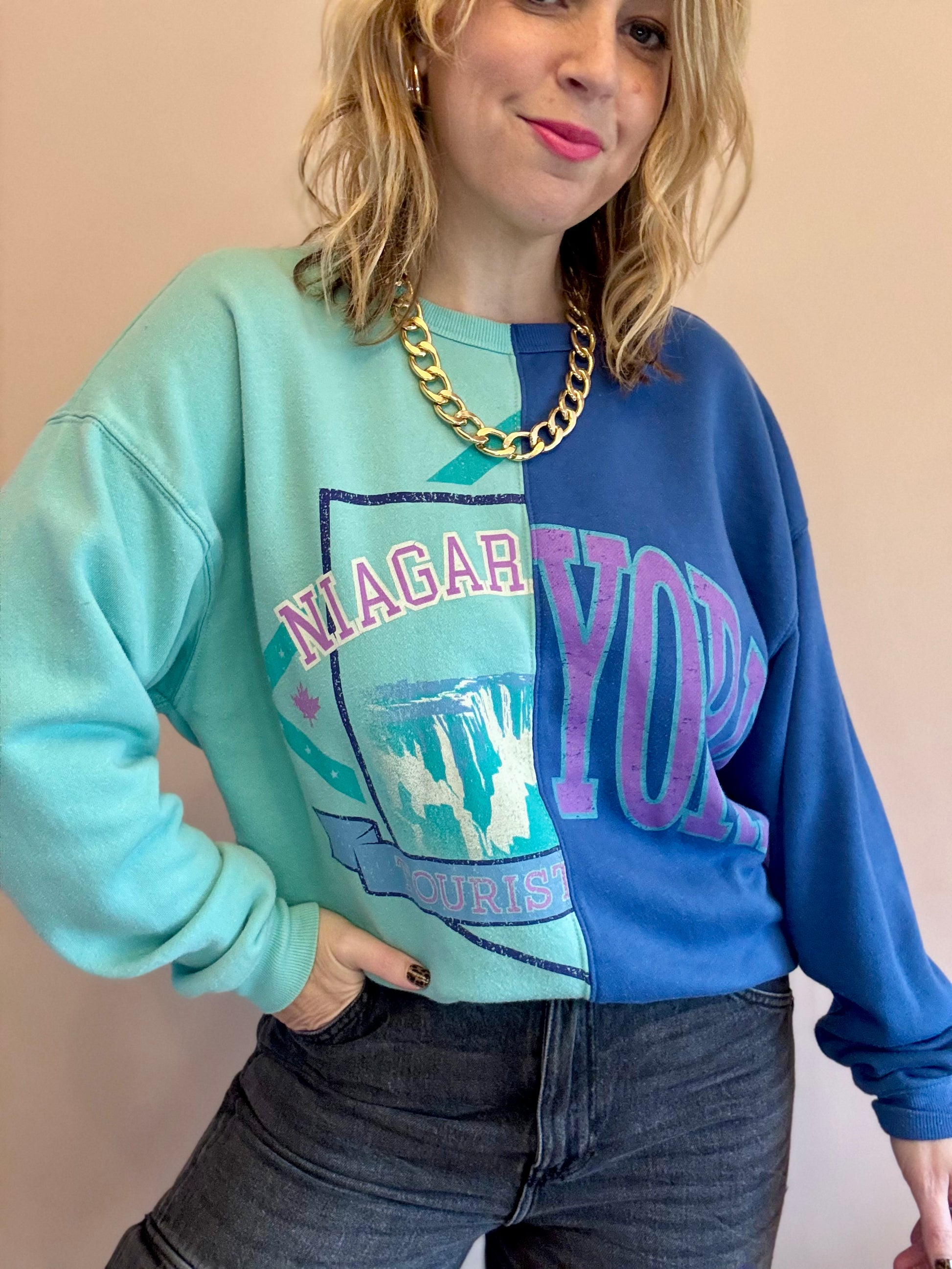 This sweatshirt has been made taking two different sweatshirts and stitching them together.