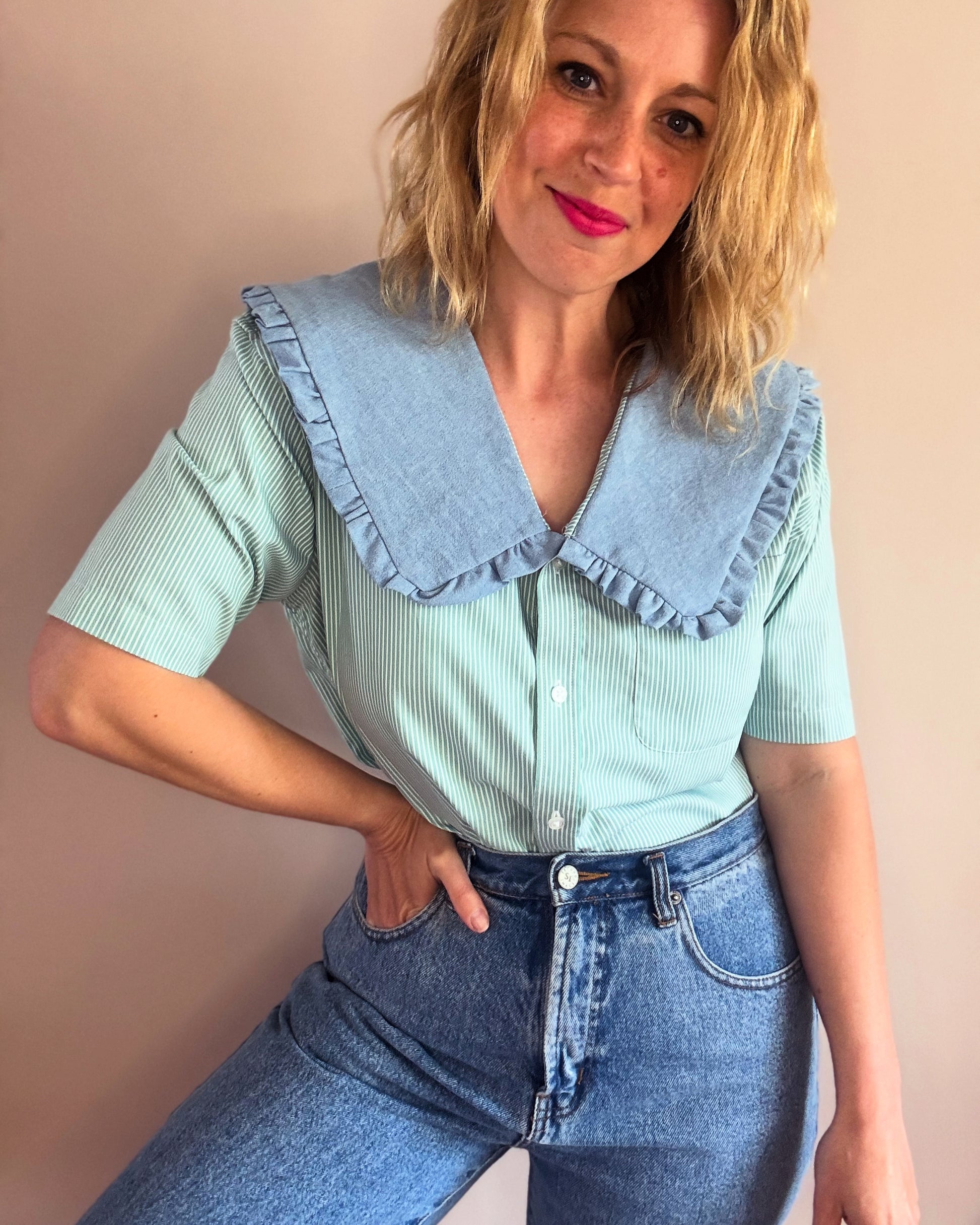 This shirt has been reworked by being cropped and a statement collar adding using vintage fabric