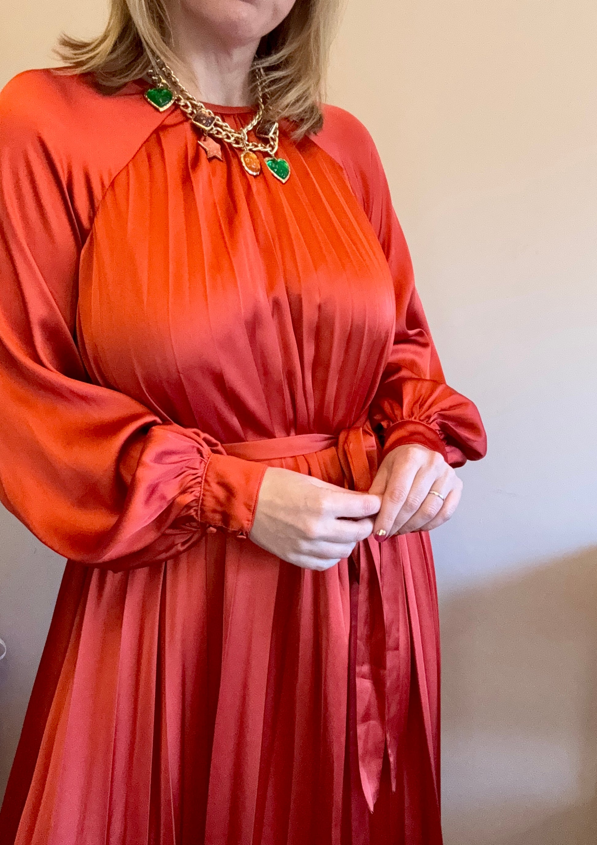 She comes with a fabric belt so can be worn more fitted or loose without the belt.
