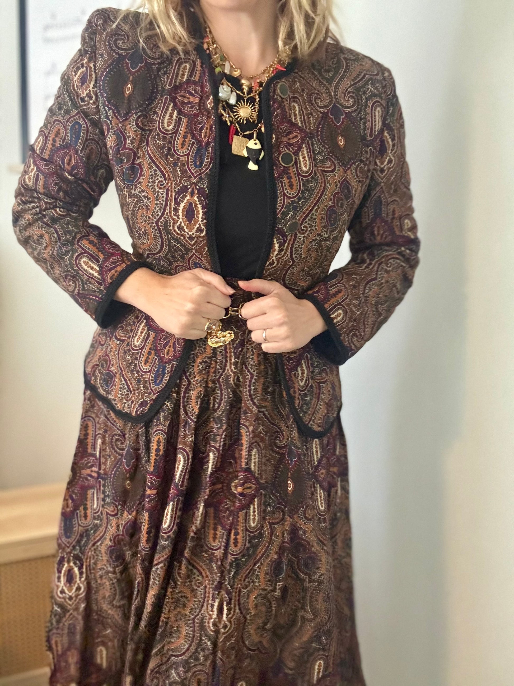 A wonderful two piece set made up of a quilted jacket and a skirt.