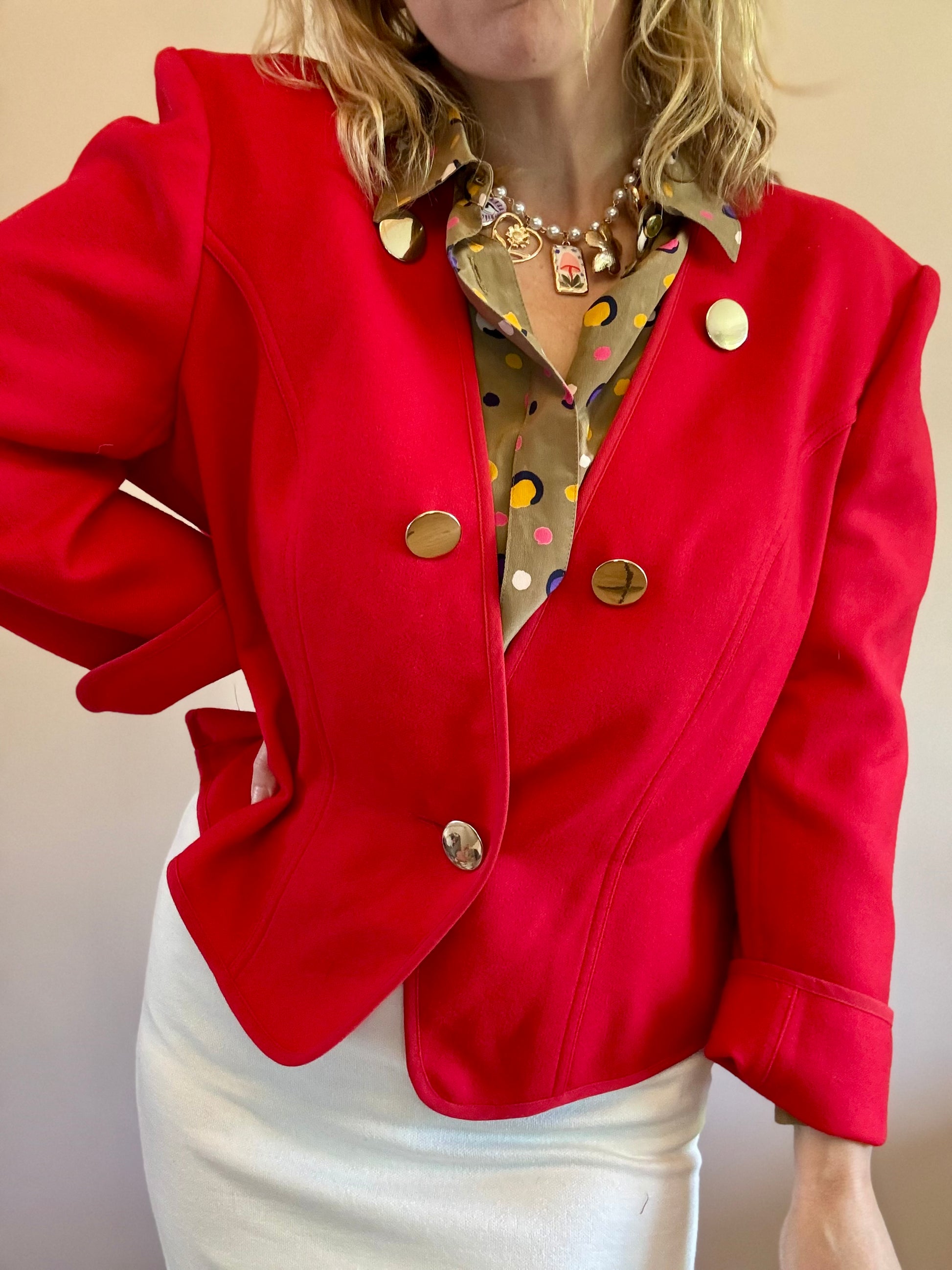 This incredible jacket is a wool piece with gold statement buttons. The buttons are mostly decorative with a one-button fastening at the bottom of the jacket.