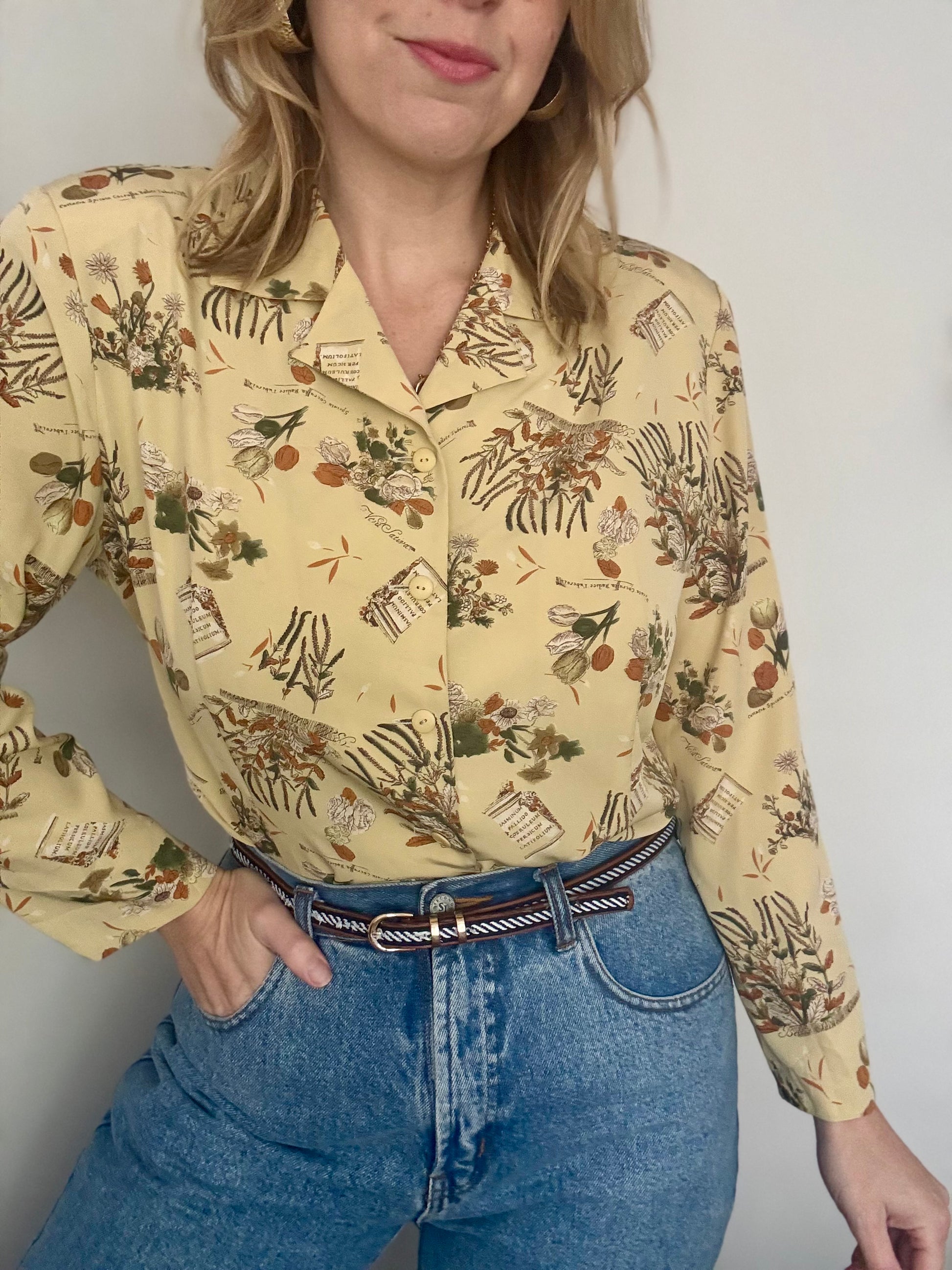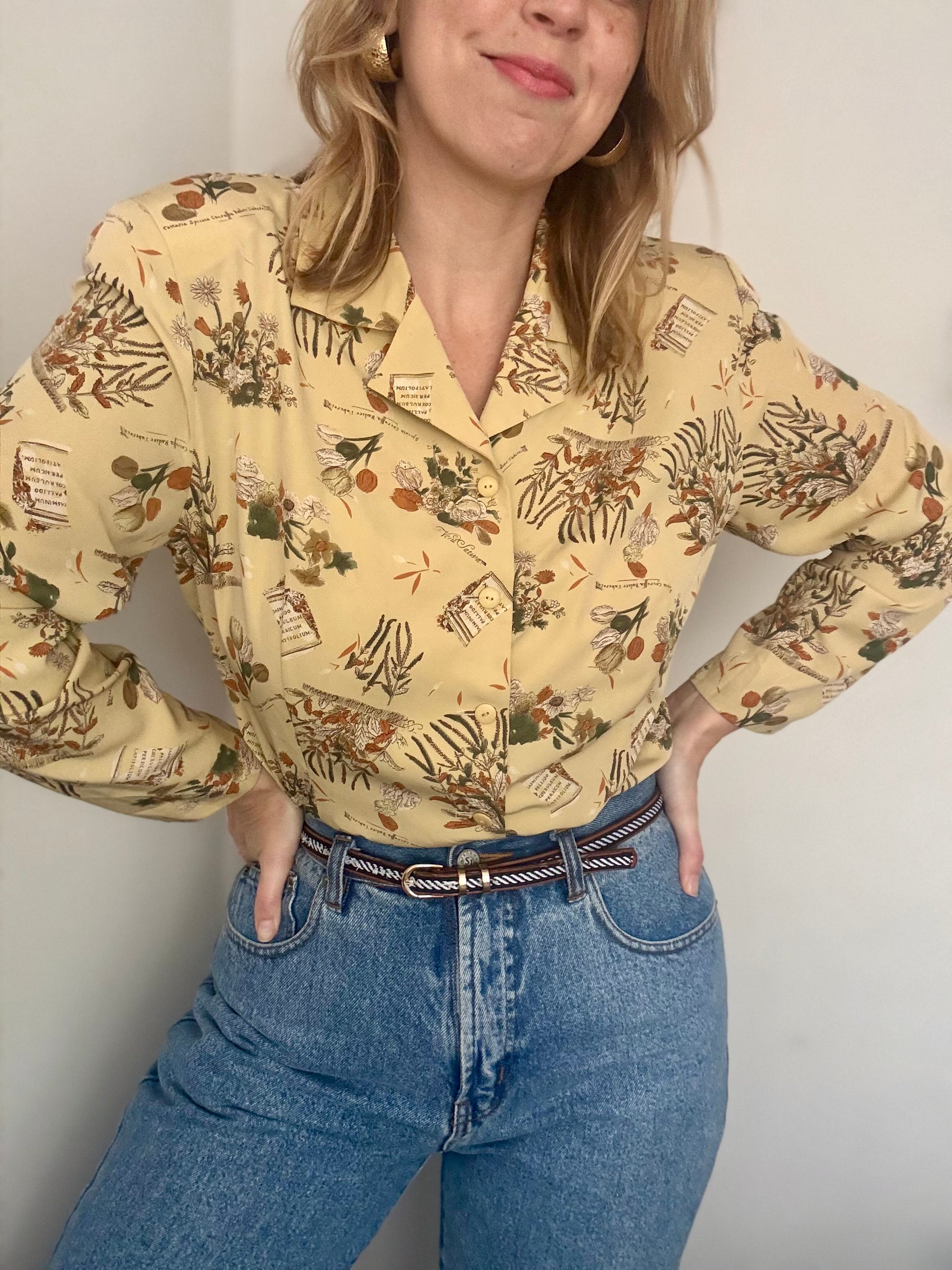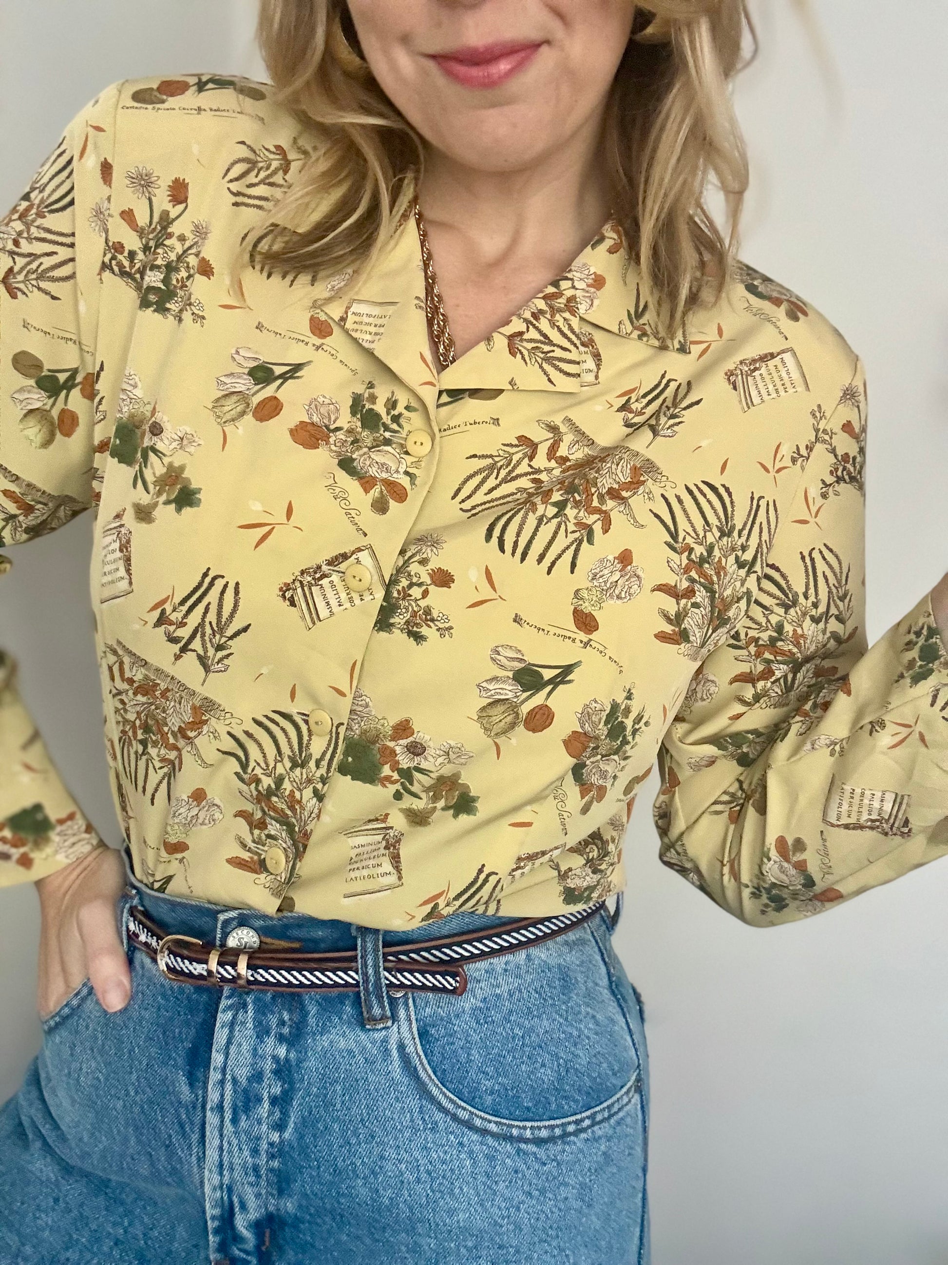 This is a wonderful vintage blouse with a romantic floral print. It has the Latin flower names written is script throughout the print and has botanical prints too.