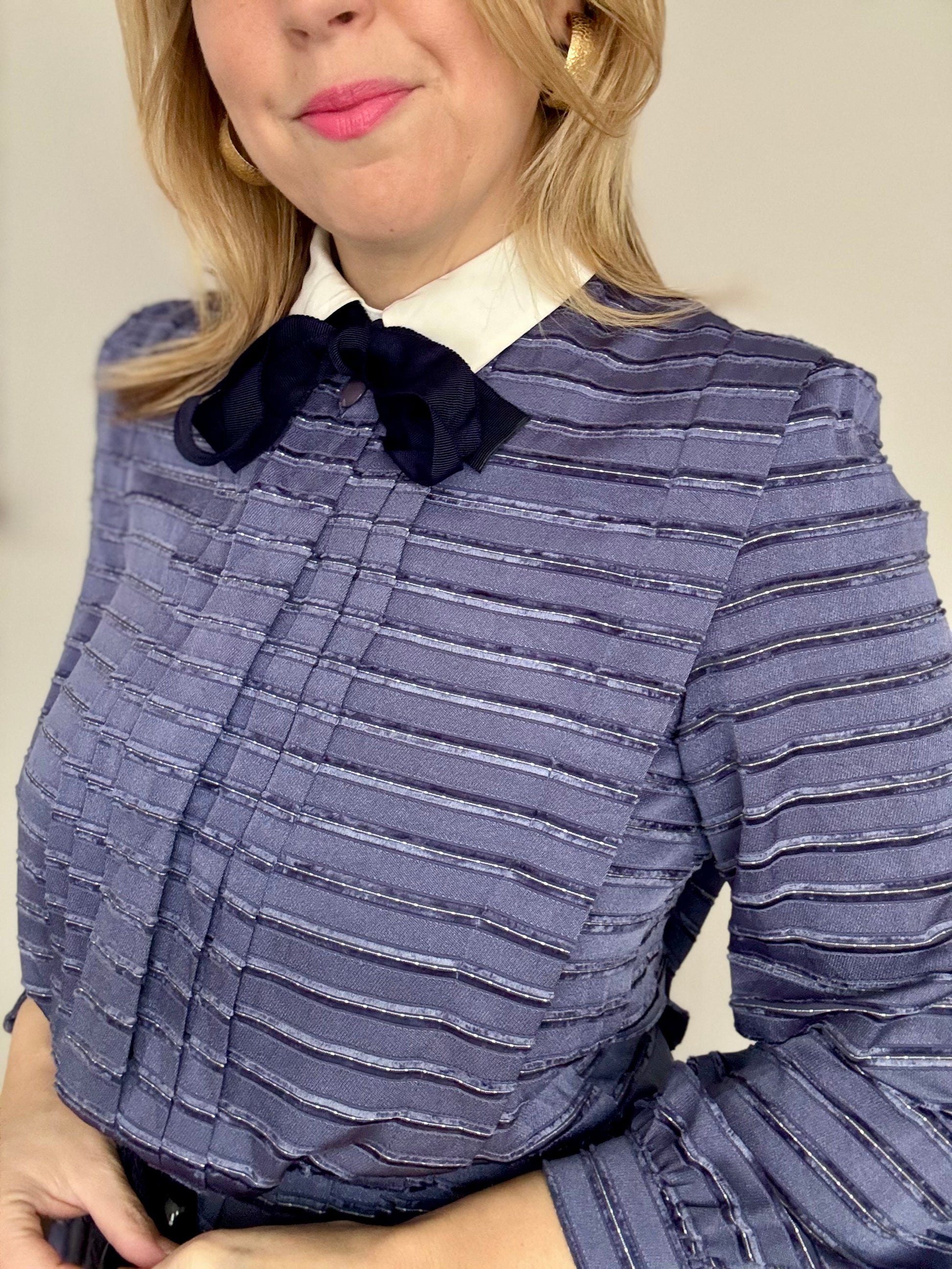 This is so unique! It has a collar with a ribbon tie bow and the bodice section is lined with a jacket section sewn into the dress. There are cords around the waist which cinch the waistline in and the material is all textured too.