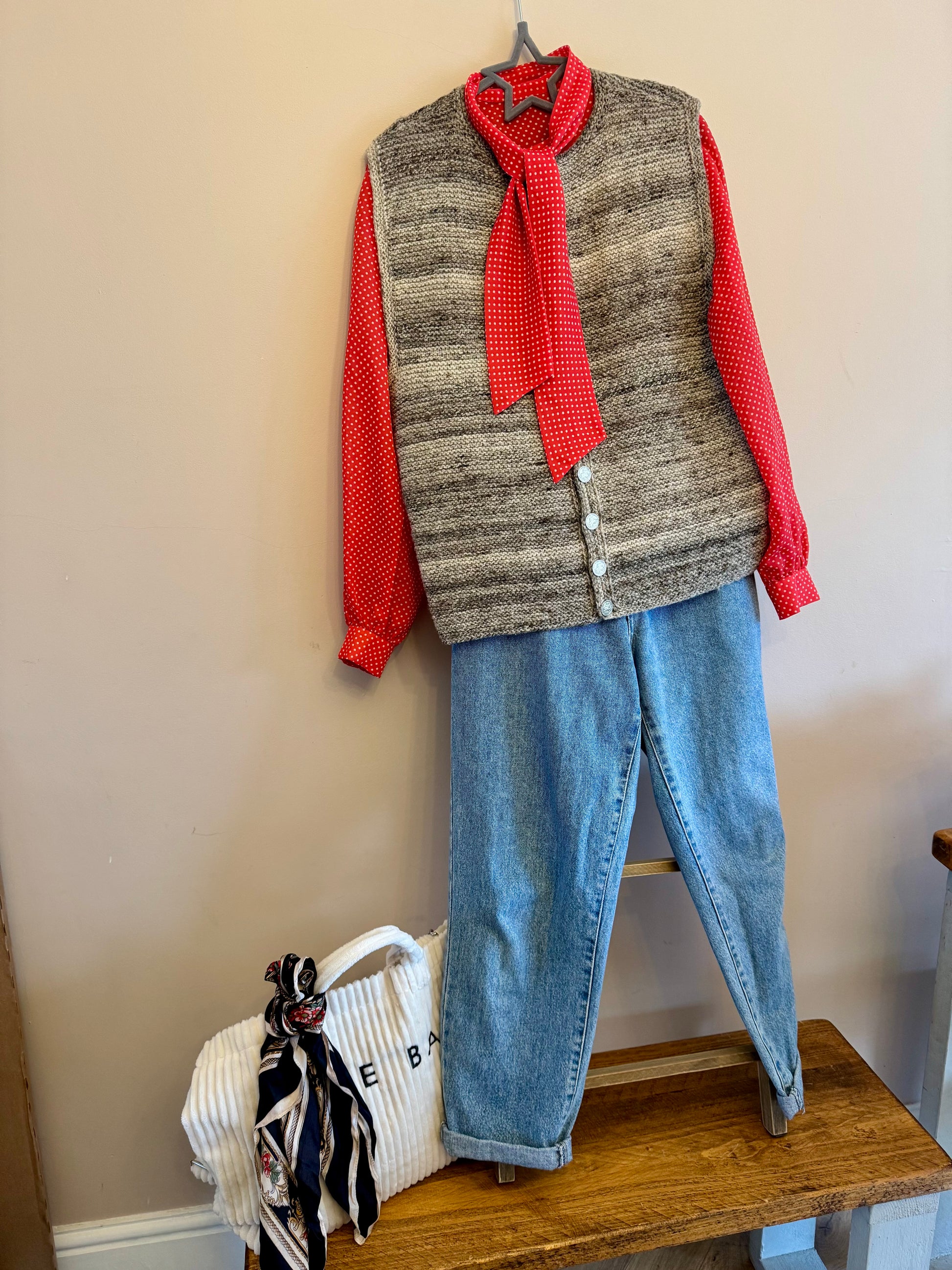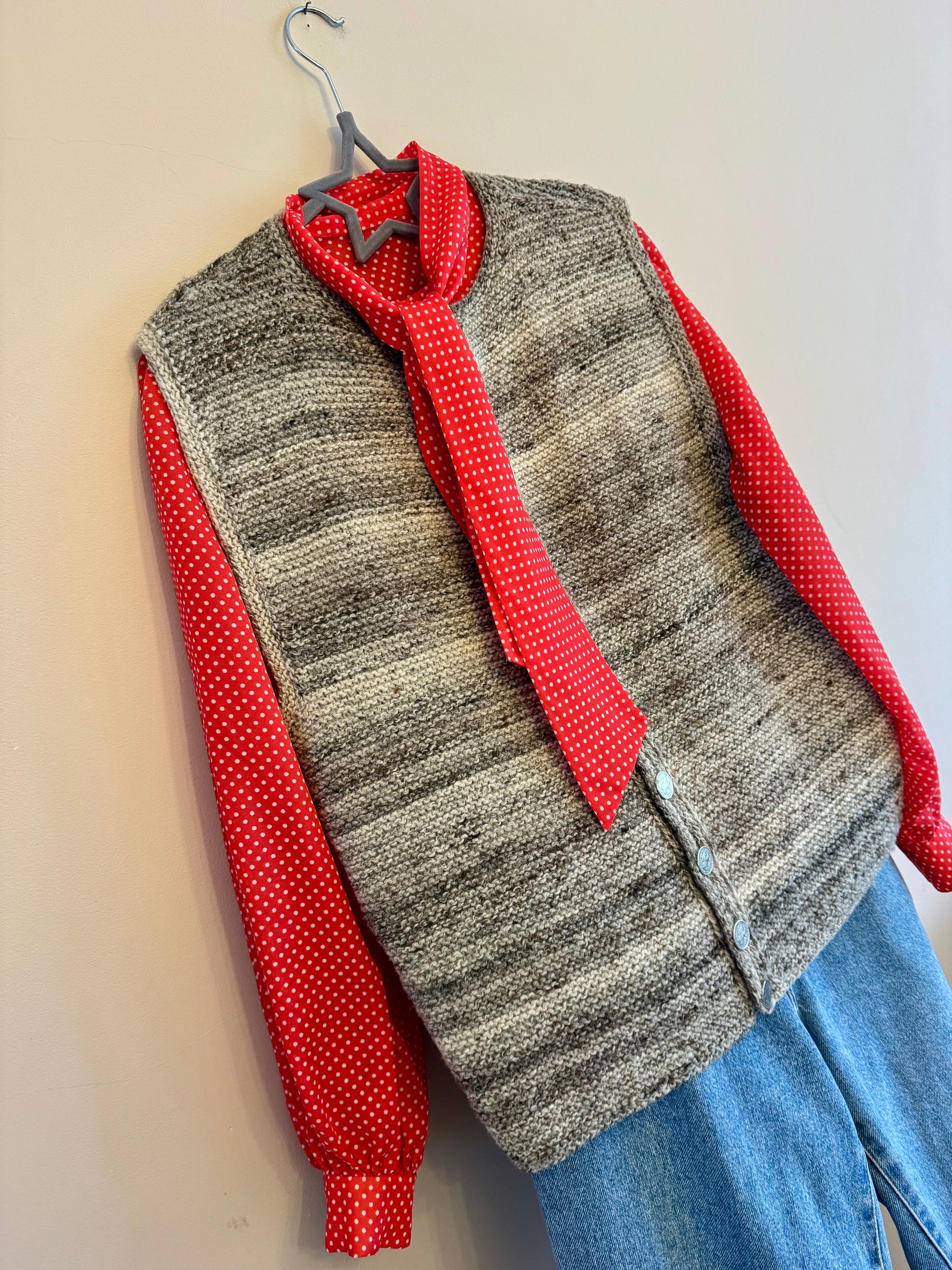 This waistcoat is one of a kind and hand knitted. It has coin buttons and is also a great length too.